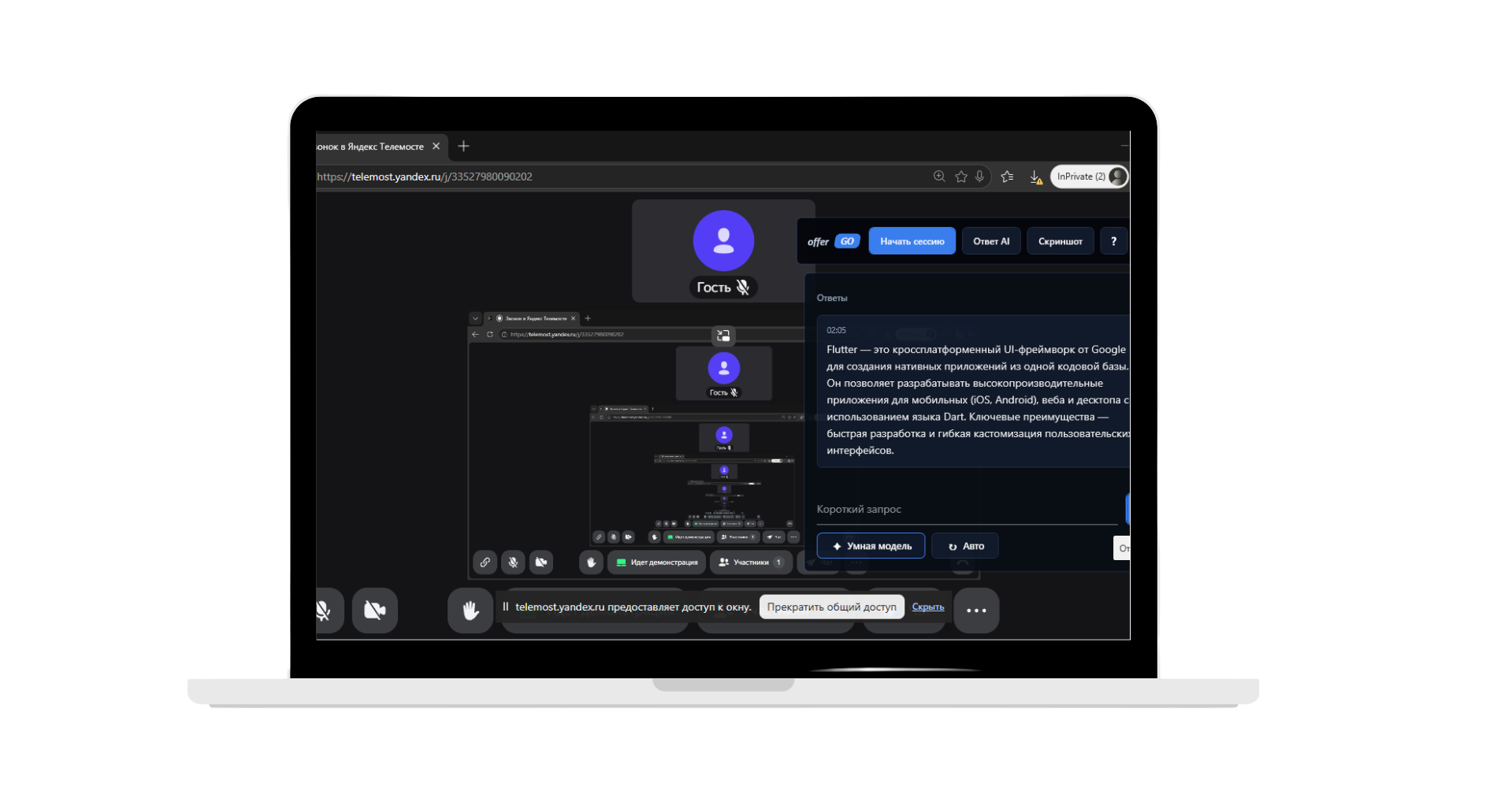 Можно снять весь экран или только область. Изображение уходит в анализ вместе с контекстом, а ответ возвращается в ту же ленту подсказок.